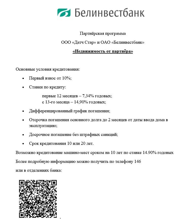 Вы можете воспользоваться программами кредитования от банка-партнера «Белинвестбанк» без увеличения стоимости: