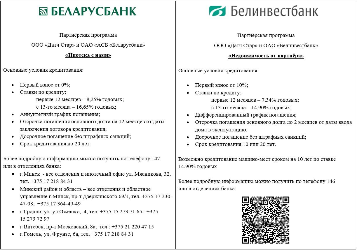 Вы можете воспользоваться программами кредитования от банков-партнеров «Беларусбанк» и «Белинвестбанк» без увеличения стоимости: